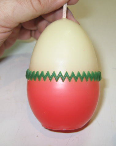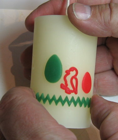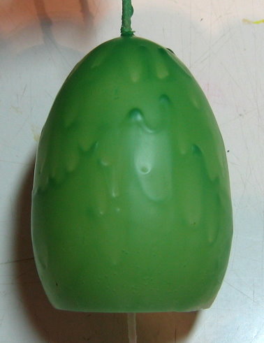 In gefärbtes Wachs halb eingetauchte Kerze aus weißem Bienenwachs. Die Tauchkannte wurde mit einer Borde aus grünem Wachs verziert.