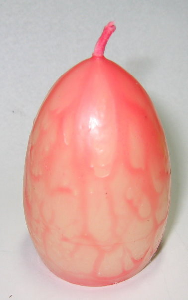 Kerze aus weißem Bienenwachs, getaucht in rot gefärbtes Bienenwachs. Ist die Temperatur des Tauchwachses sehr heiß (hier ca. 95 °C) so läuft das Wachs ab und es entstehen interessante Muster.
