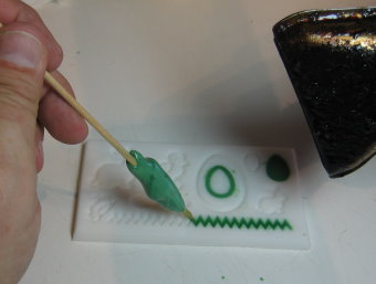 Herstellung von Verzierungen mit gefärbtem Wachs und einer Heißluftpistole. Wahlweise kann man auch das Wachs überschüssige Wachs direkt nach dem Gießen mit einer Spachtel abziehen