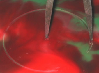 Aus einer Wachsplatte, hergestellt aus farbigen Wachsresten wird eine kreisförmige Wachsplatte ausgeschnitten (hier mit einem Stechzirkel)