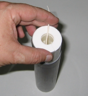Mit Dochthalter versehen ist die Form nun zum Gießen fertig. |
